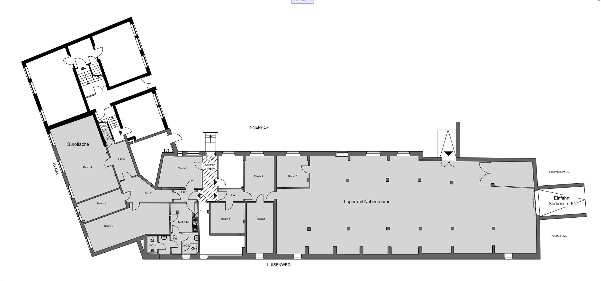 Zu vermieten ist eine Lagerfläche mit angrenzenden Büroflächen. Von der Sorbenstraße aus gelangen Sie über ein Rolltor in die großzügigen Lagerflächen. Über einen Flur gelangen Sie zu den Büroräumen. Diese verfügen über getrennte Damen- und Herren WCs und eine moderne, rote Hochglanzeinbauküche. Durch die gut platzierten Fenster ist die Bürofläche sehr hell und freundlich.